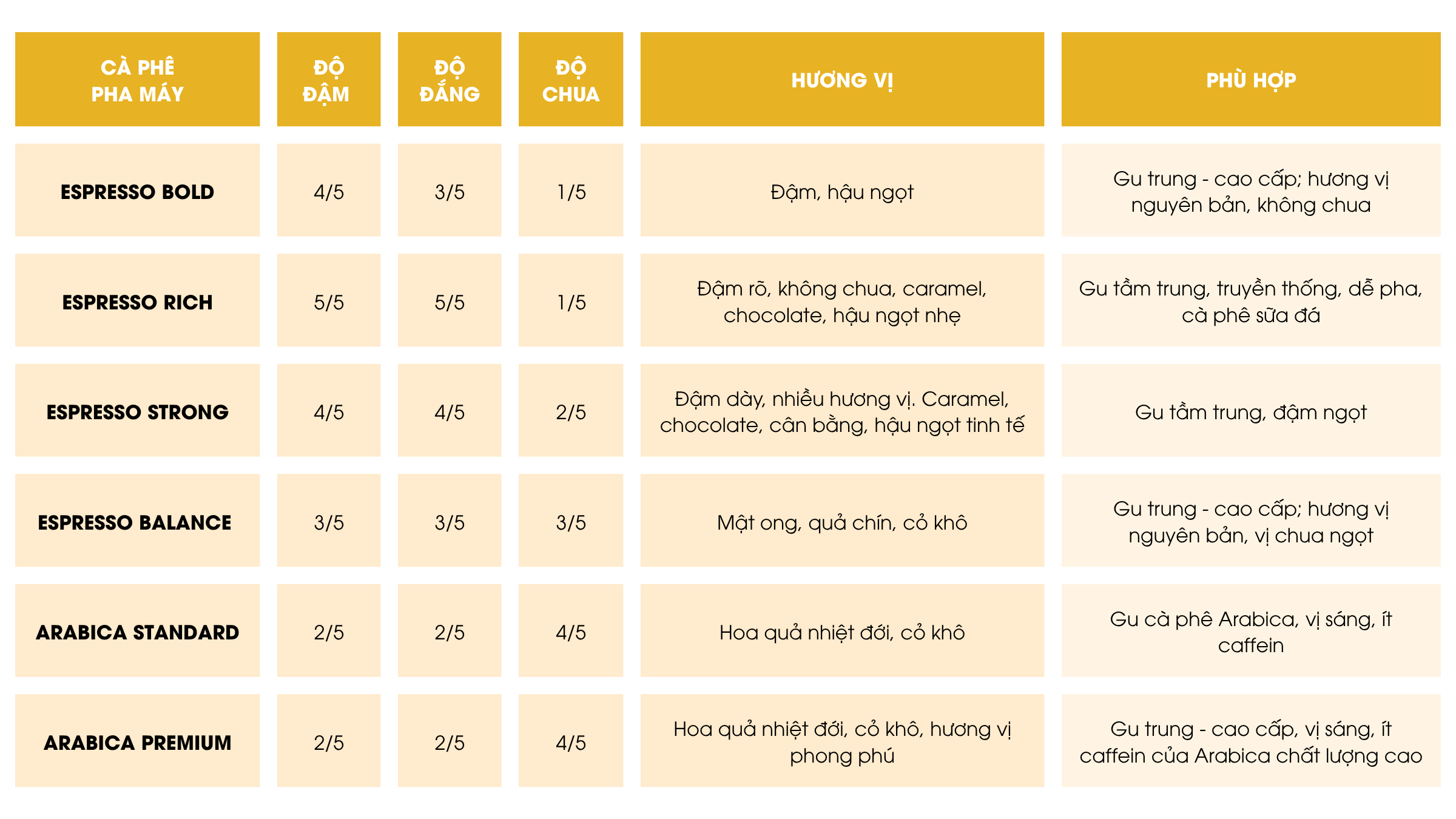 BẢNG HƯƠNG VỊ CÁC DÒNG CÀ PHÊ PHA MÁY TỪ VOIDO COFFEE ROASTER