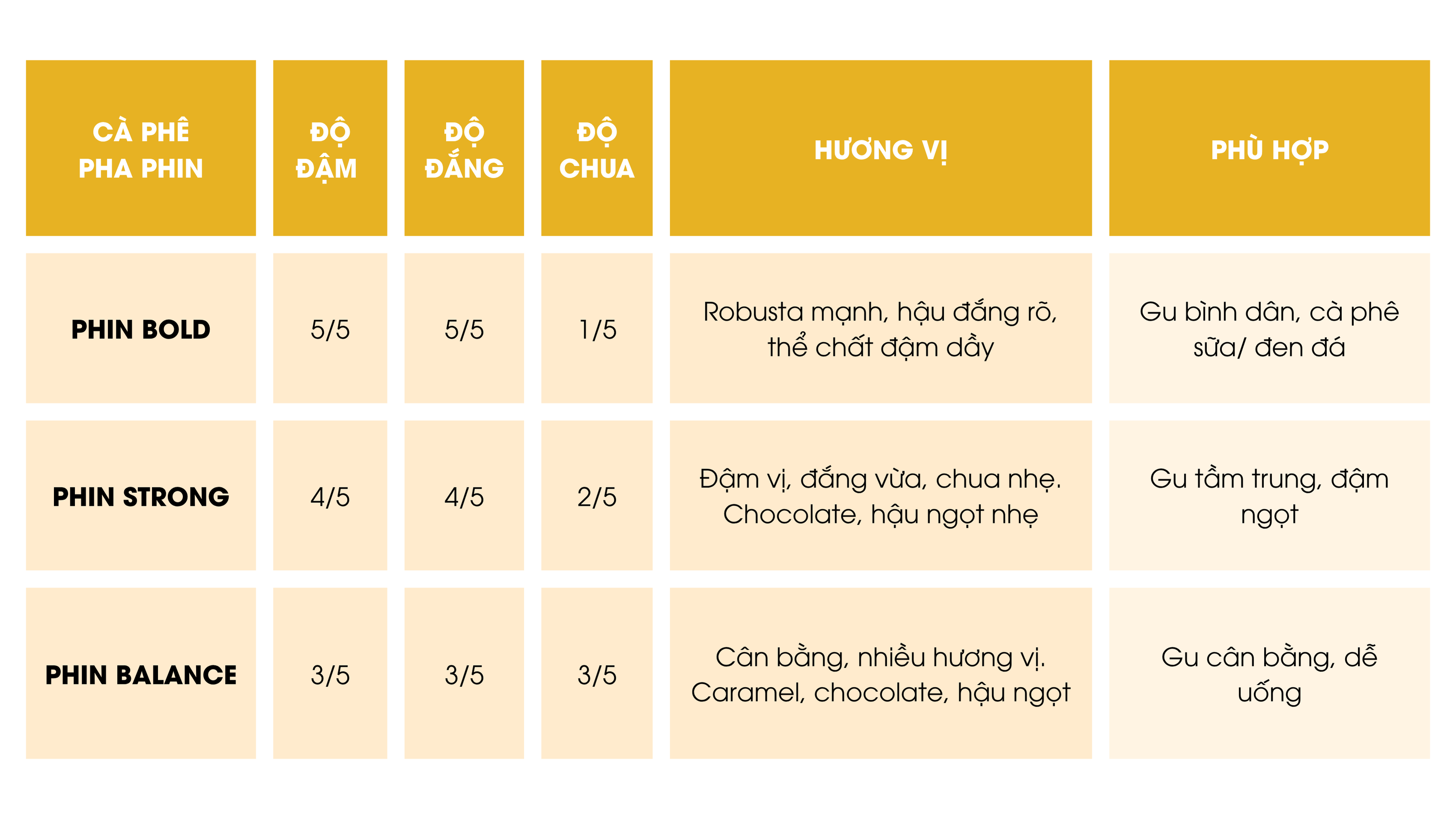 Phin Strong (80 Robusta - 20 Arabica): Thể chất đậm, vị đắng vừa, chua nhẹ tinh tế, hậu đắng ngọt mượt mà sau khi uống. Phù hợp cho quán cà phê tầm trung, tập trung vào trải nghiệm hương vị cho khách hàng.