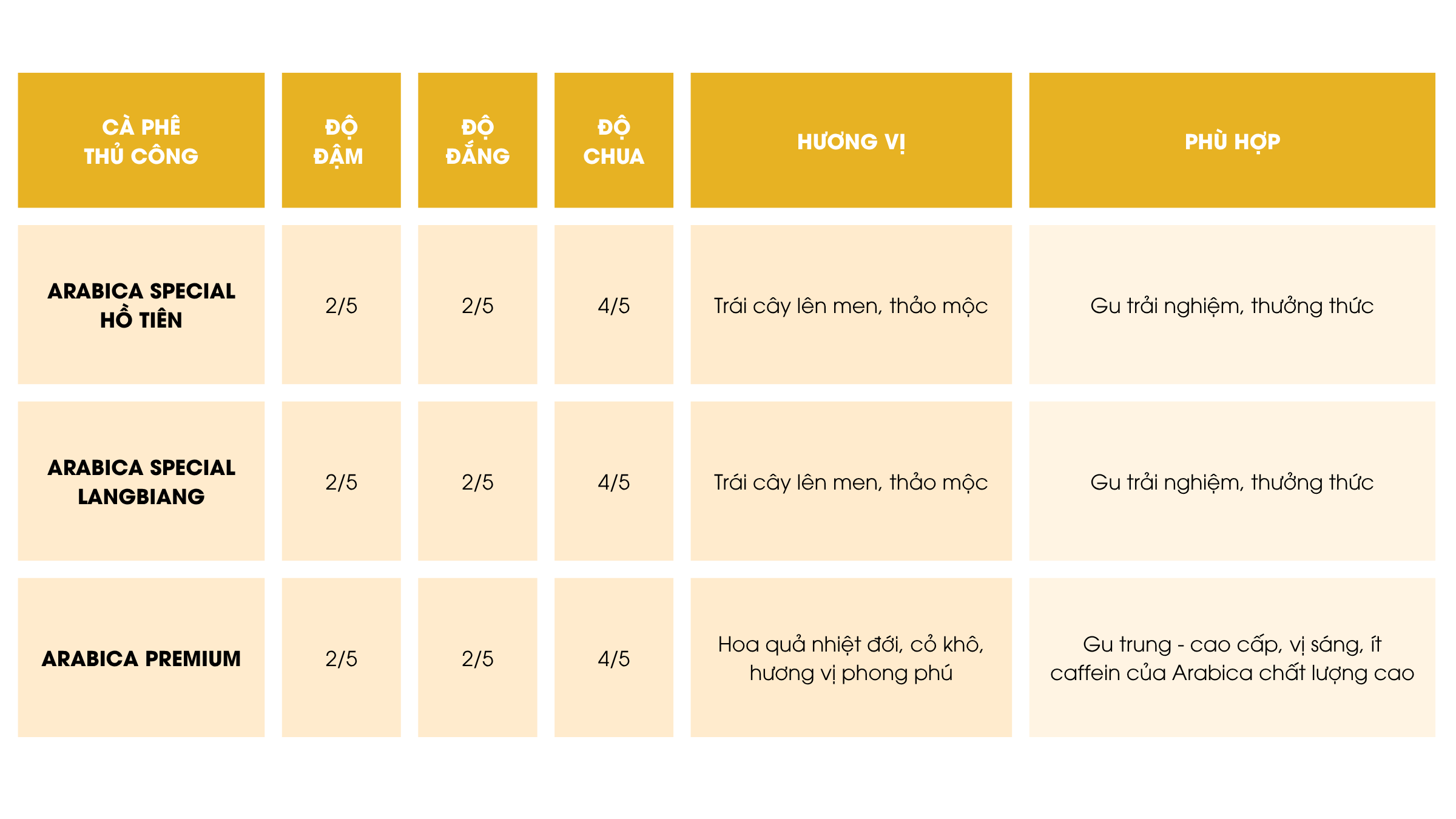 100% Arabica rang nhẹ - vừa, sơ chế và rang thủ công, sản lượng giới hạn từ vùng Hồ Tiên – Đà Lạt.