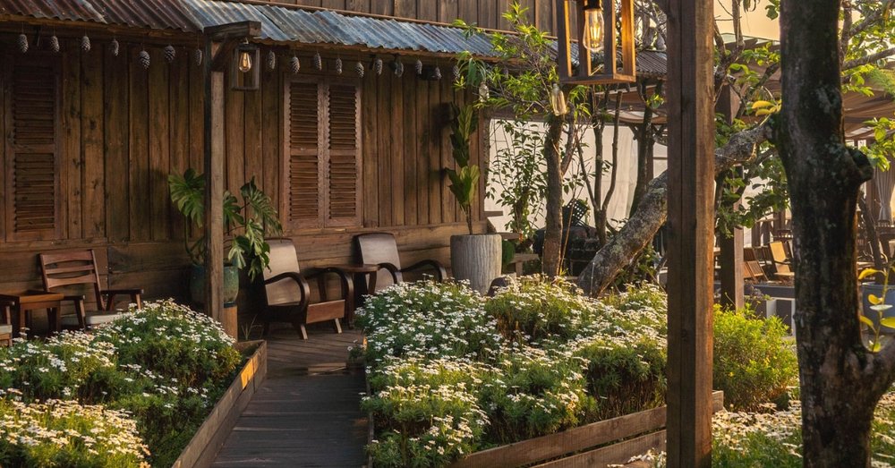 Thiết kế của Tiệm cà phê Bình Minh Ơi mang phong cách cổ điển, với sử dụng chủ yếu là gỗ, tạo nên vẻ đẹp mộc mạc và không gian bình yên giữa núi đồi. Khu vườn rực rỡ với những bồn hoa cúc họa mi tô điểm, tạo nên nhiều góc view siêu đẹp và thú vị, tạo cảm giác thư giãn và chill. Không thể bỏ qua cơ hội ngắm đồi núi, bình minh và săn mây cực đỉnh tại quán này đâu nhé.